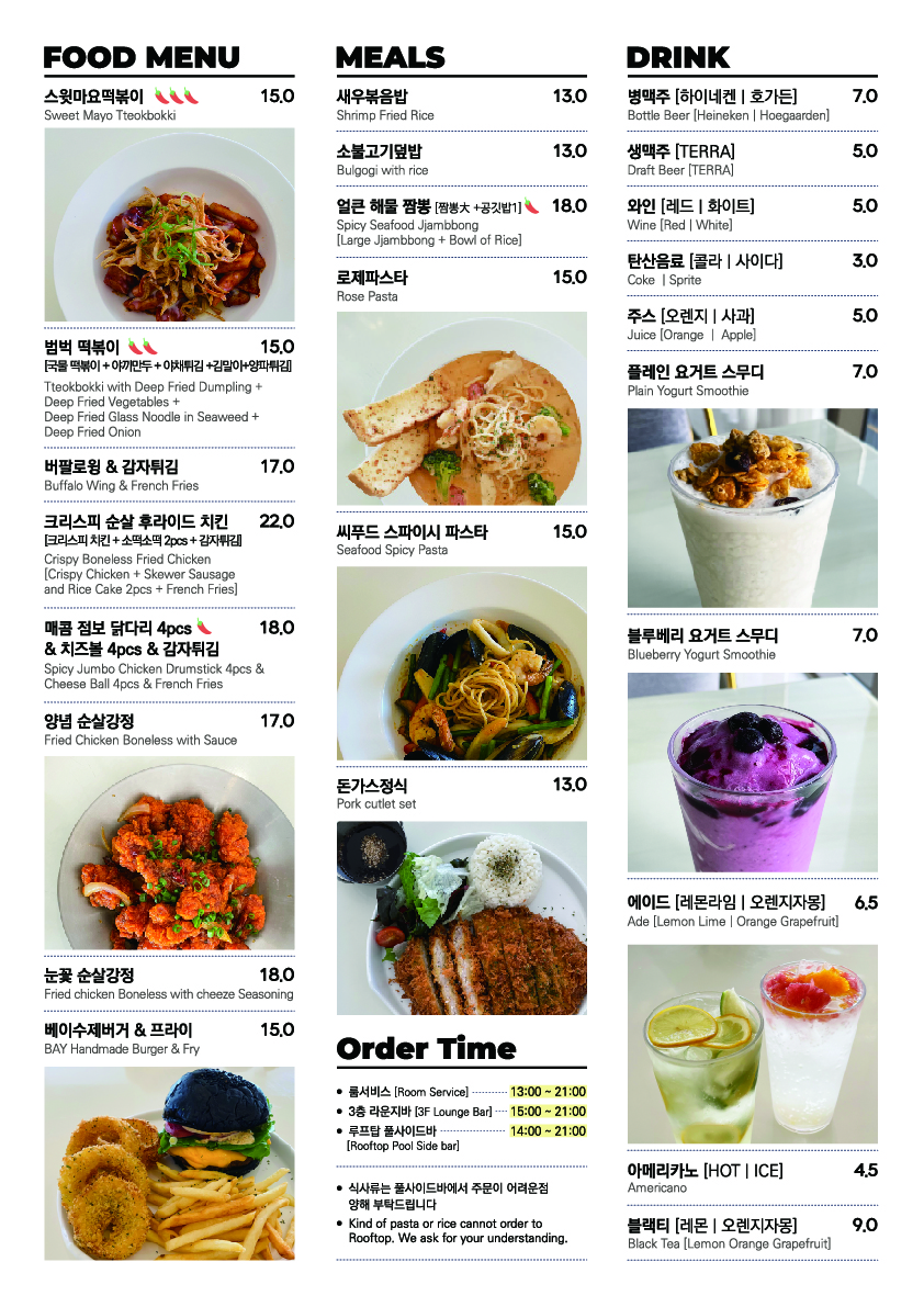Break Time: 10:00-14:00PM(매일) 단, 룸서비스 및 루프탑 서비스는 13:00PM부터 이용 가능합니다. |