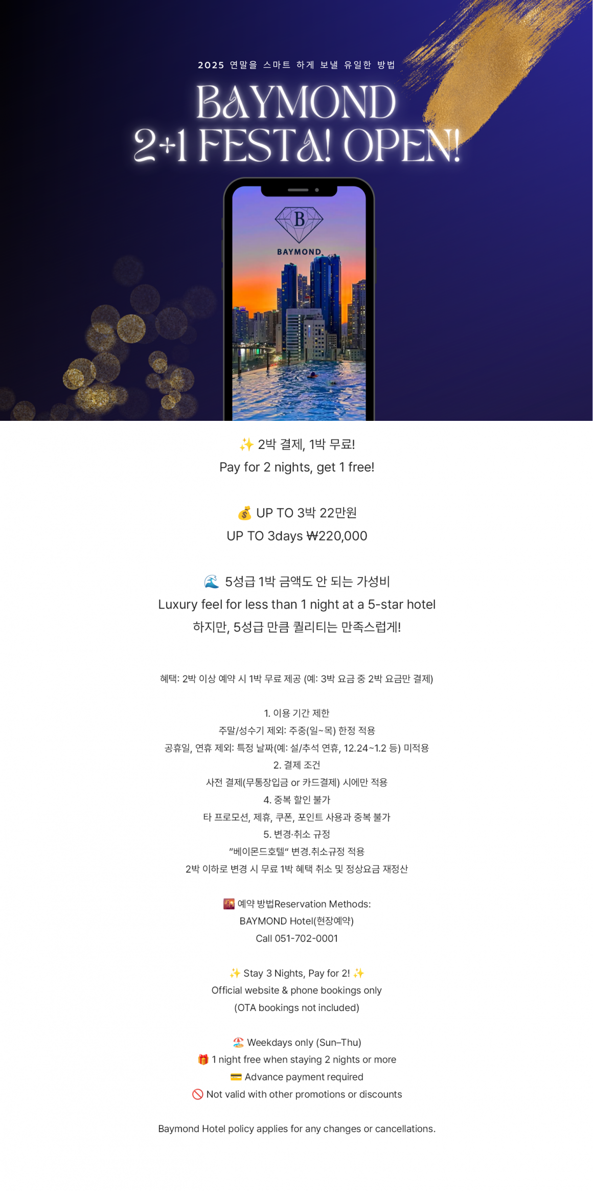 2박 이상 예약 시 1박 무료 제공 (예: 3박 요금 중 2박 요금만 결제)